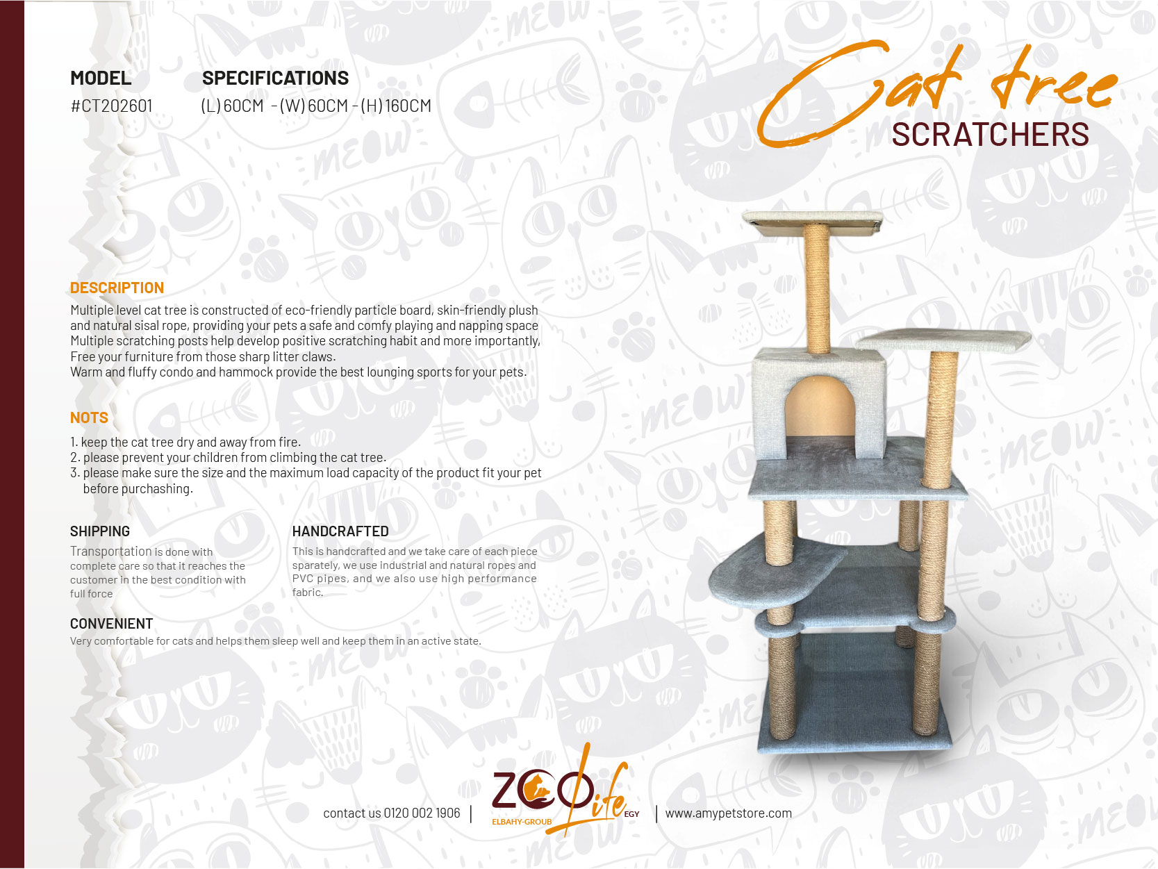 SPECIFICATIONS (L) 60CM – (W) 60CM – (H) 160CM   DESCRIPTION Multiple level cat tree is constructed of eco-friendly particle board, skin-friendly plush and natural sisal rope, providing your pets a safe and comfy playing and napping space Multiple scratching posts help develop positive scratching habit and more importantly, Free your furniture from those sharp…